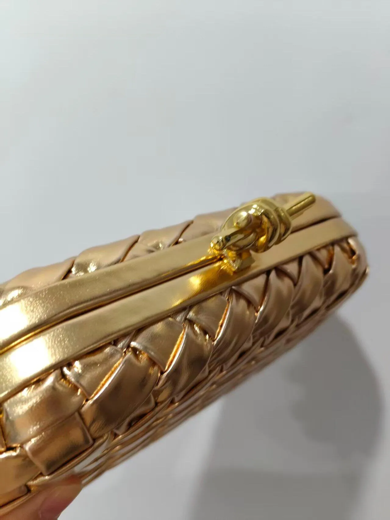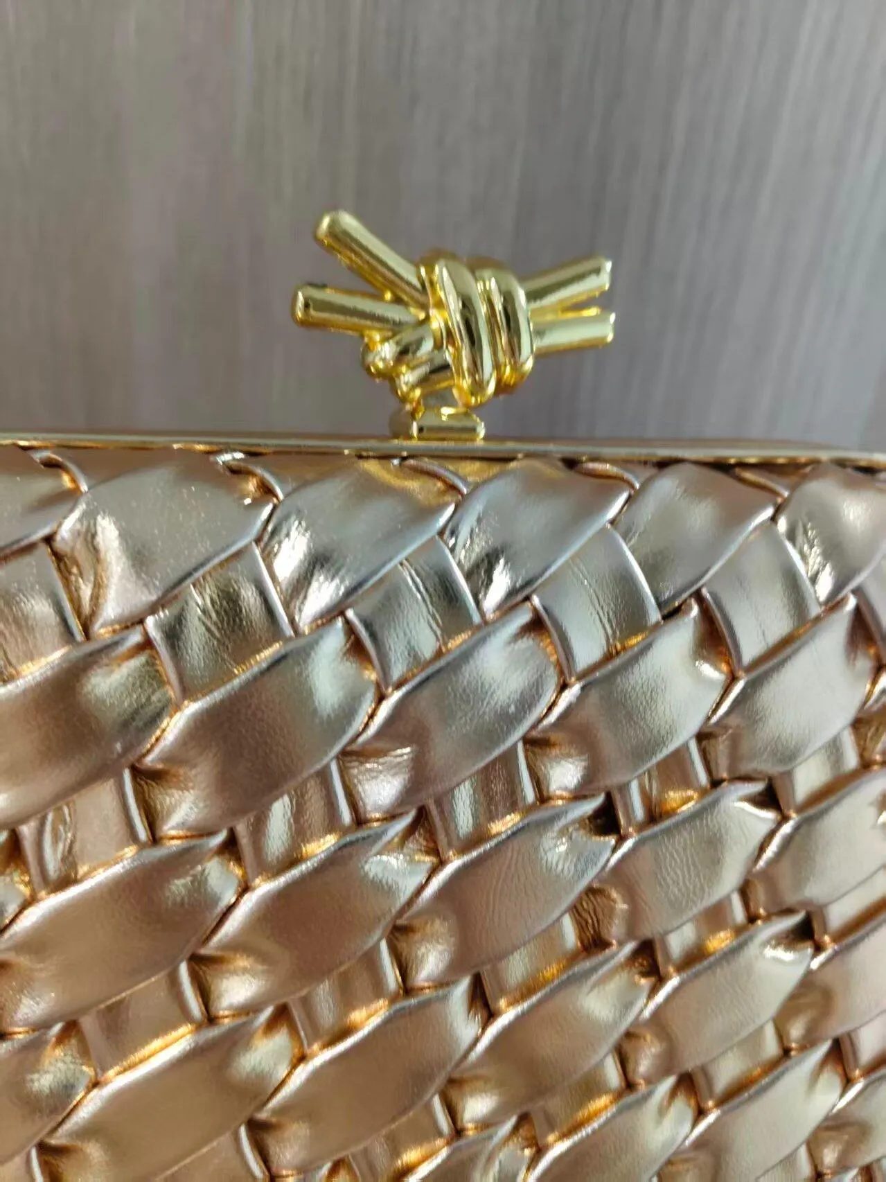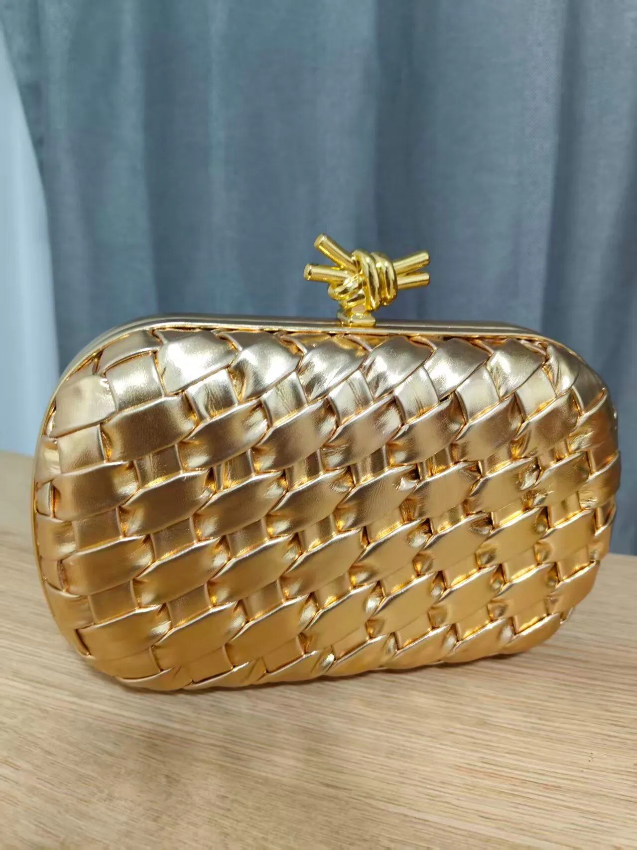 The Aurélie Lumière Clutch exudes elegance and opulence with its gleaming golden silhouette. Masterfully woven from metallic leather, the bag's textured surface reflects light in a symphony of warmth and radiance. The sculptural knot clasp at the top adds a sophisticated touch, combining contemporary design with timeless artistry. Its sleek, structured form and delicate chain strap offer versatility for both day and evening wear, making it an ideal companion for the modern woman. The Aurélie Lumière Clutch is a statement of luxury, designed to elevate both minimalist and opulent outfits with refined grace and timeless appeal.