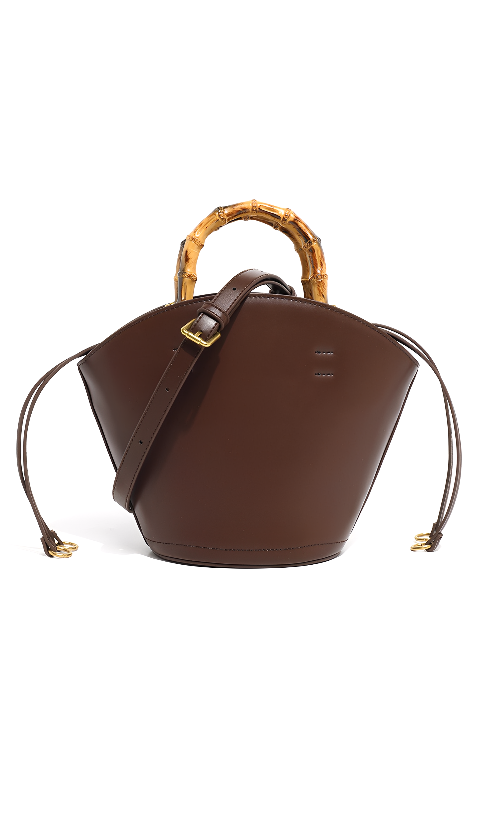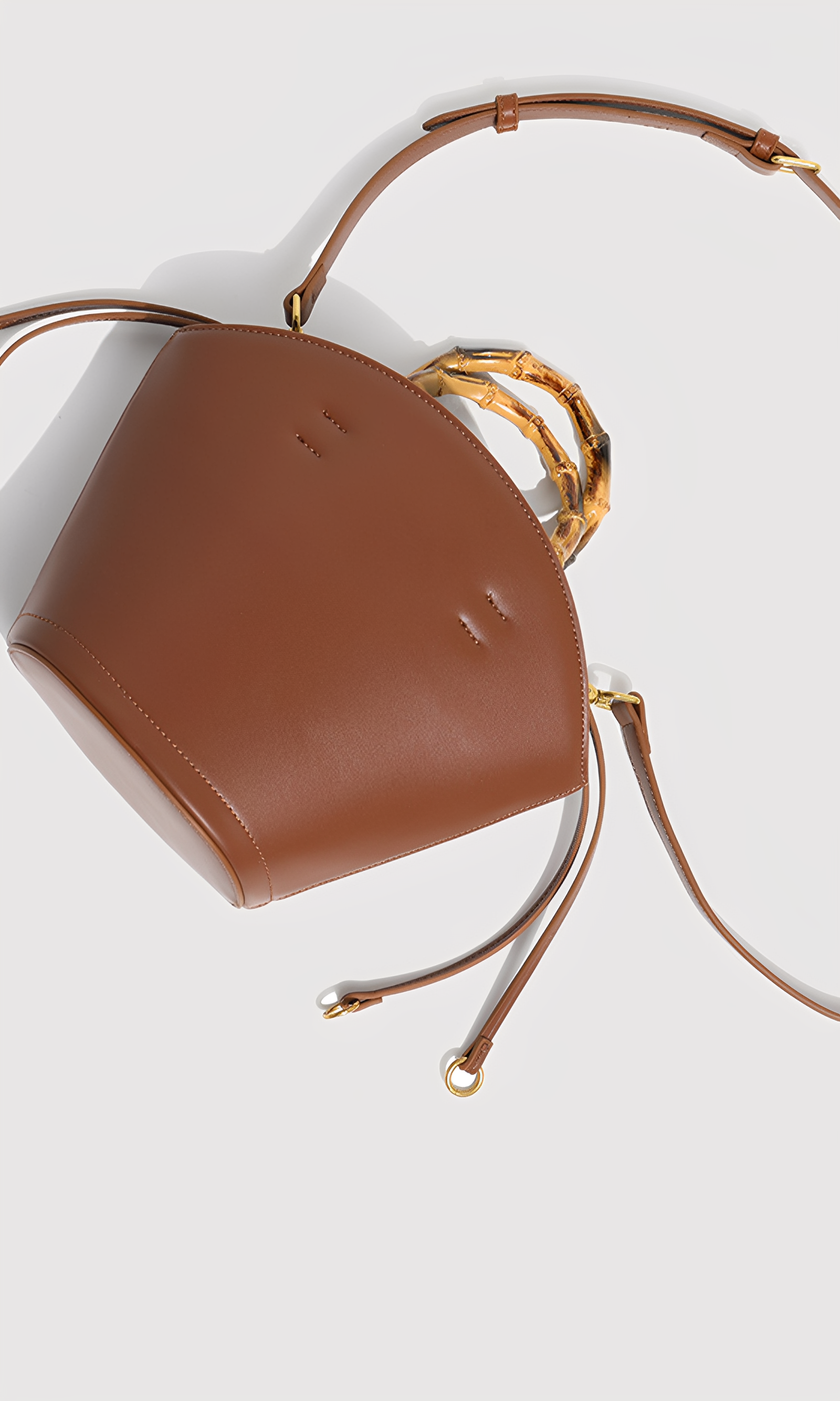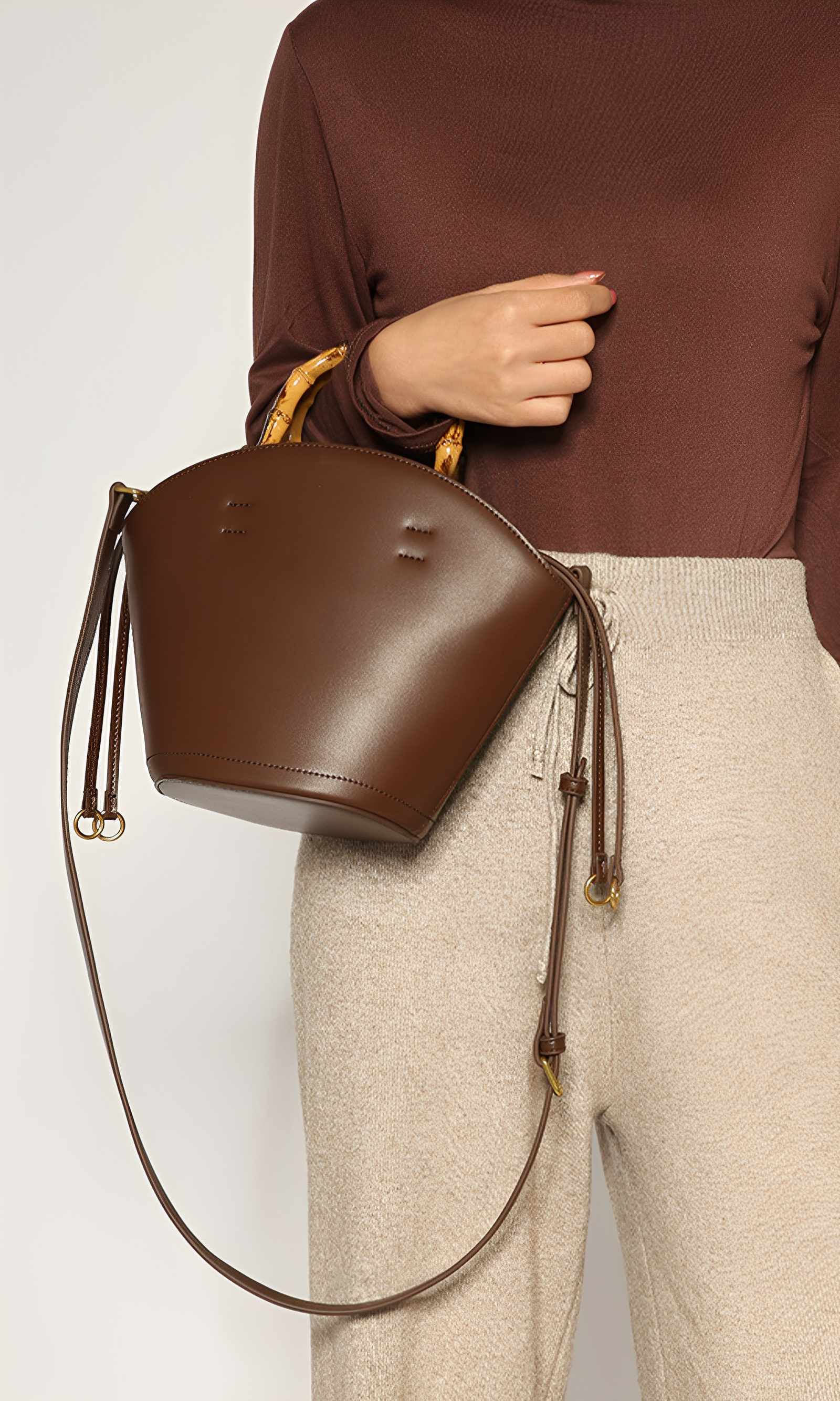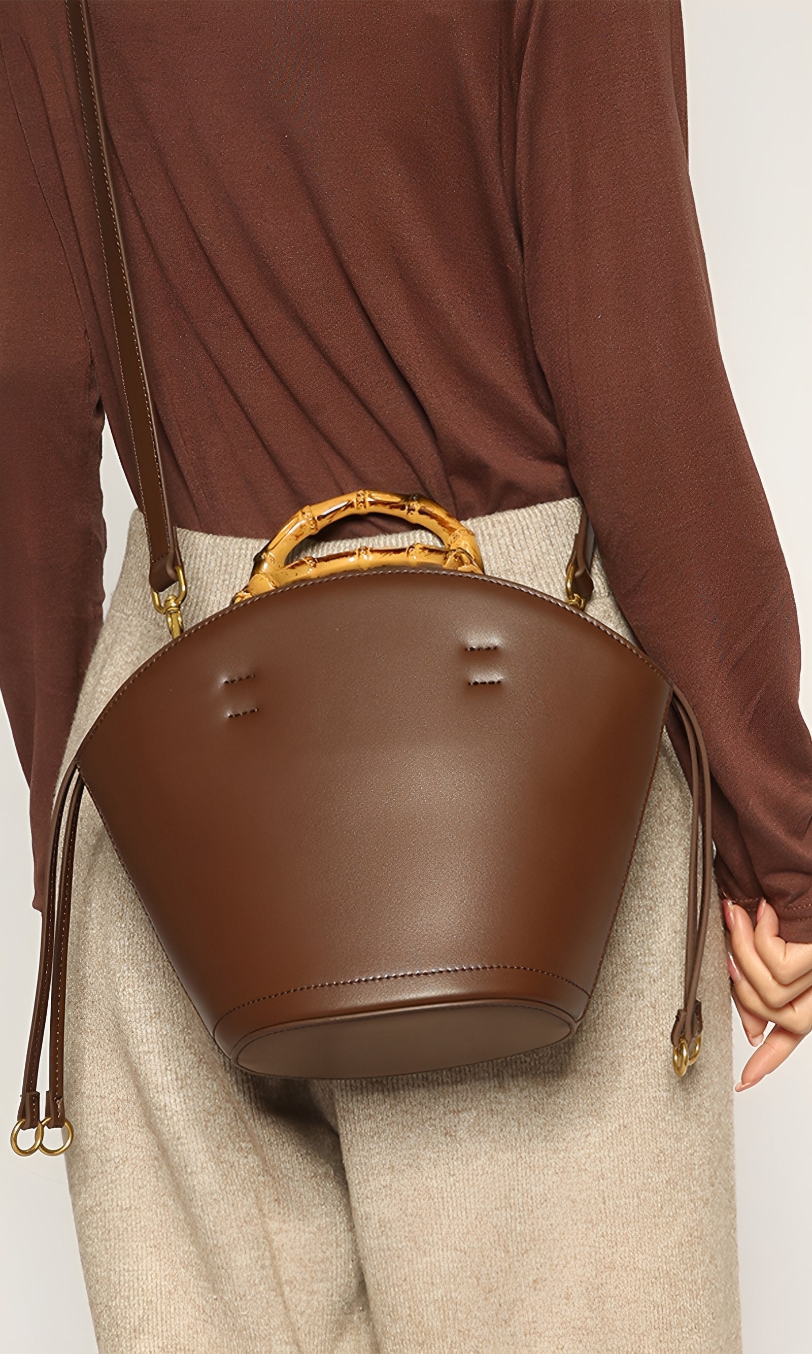 The Bamboo Muse is a harmony of natural charm and refined structure. Defined by its sculptural silhouette and graceful arc, this bag reimagines the classic bucket form with a touch of artisanal sophistication. Crafted from smooth vegan leather, its surface radiates sleek modernity, while the bamboo top handle introduces an organic elegance and tactile allure. The detachable crossbody strap and polished hardware provide versatile styling, adding subtle refinement to its bold design. This bag embodies balance—structured yet fluid, timeless yet distinctive.