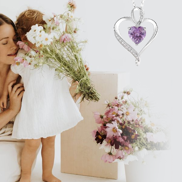 This Mother's Day, express your love with the "Heart Embrace" necklace. Featuring a stunning lavender gemstone at its core, surrounded by a halo of sparkling diamonds, this pendant symbolizes the warmth and affection of a mother's love. Crafted in sterling silver, it's a timeless tribute to the special woman who holds your heart.