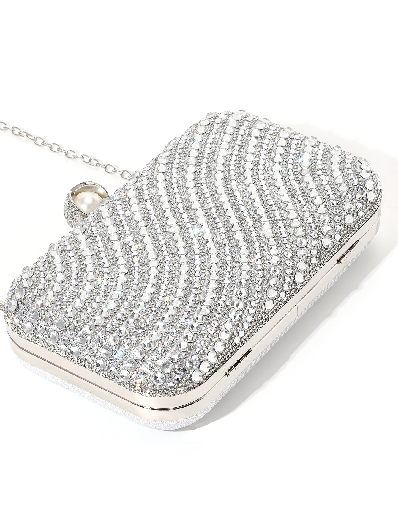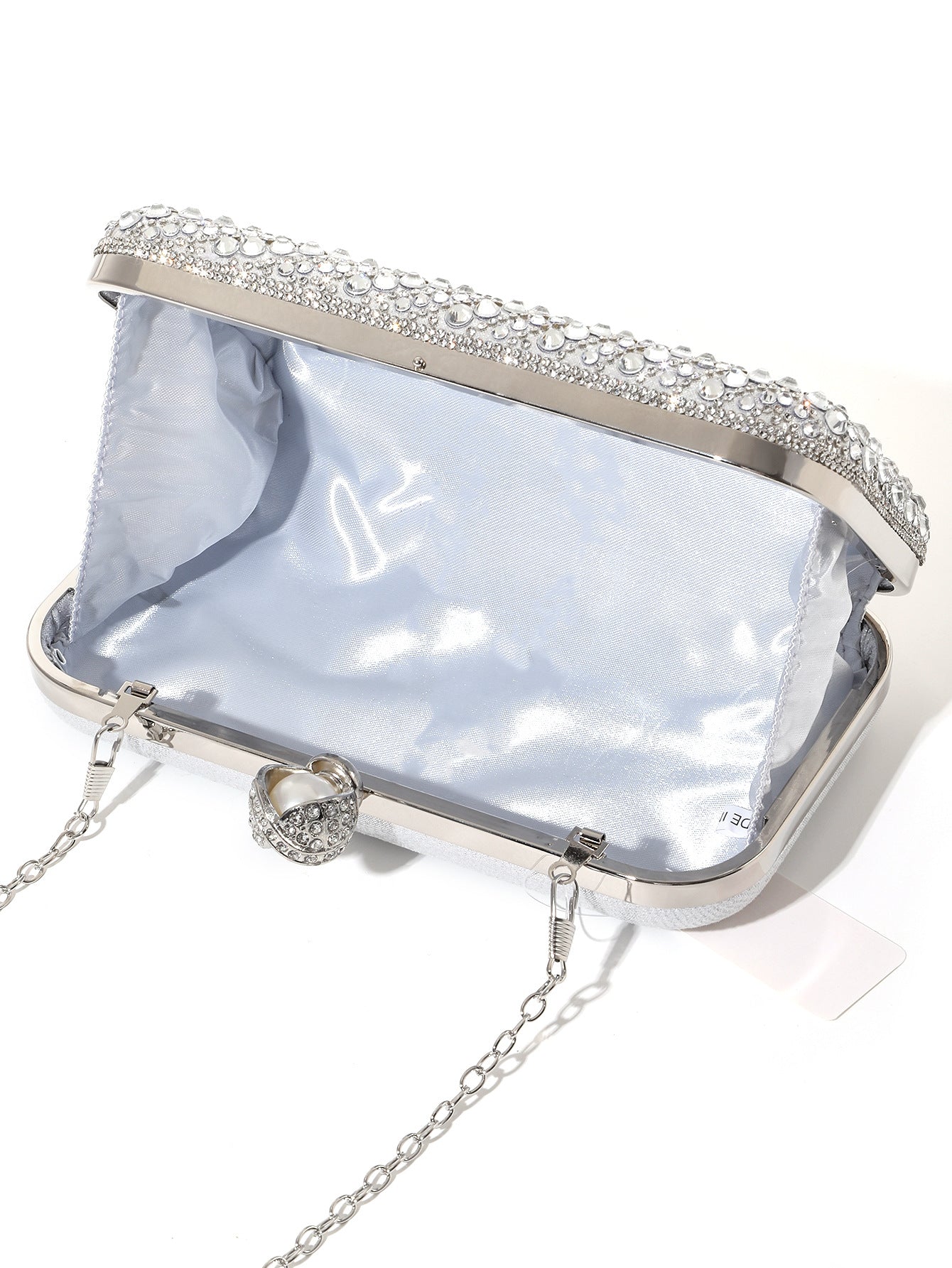 Crafted from luxurious polyester and hand-adorned with shimmering crystals, it exudes timeless beauty and grace. The elegant pearl clasp closure adds a touch of regal charm, while the detachable chain strap allows versatile styling — hold it as a clutch or wear it gracefully on the shoulder.