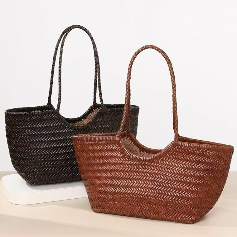 This dark brown woven tote is perfect for a day at the market or a casual outing. It's spacious, stylish, and the sturdy handles make it easy to carry. A great addition to any wardrobe for its versatility and elegance.