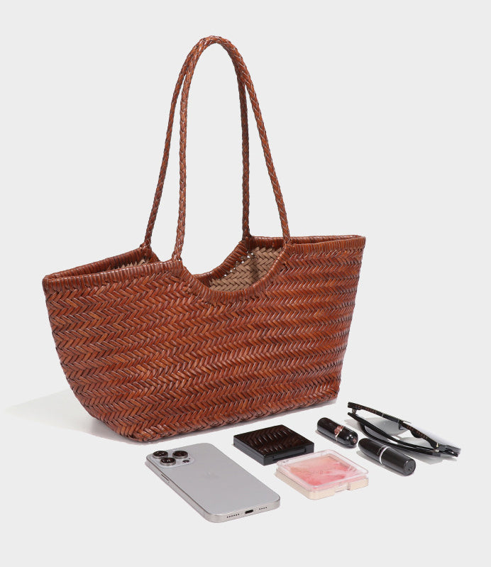 This woven tote bag offers ample space to hold everyday essentials such as a smartphone, wallet, compact mirror, lipstick, and sunglasses, making it a versatile choice for daily use.