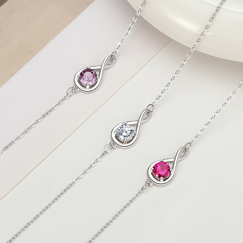 The “Infinity” Gemstone Bracelet showcases a striking red gemstone set within an infinity symbol, representing eternal love. This delicate silver bracelet is a symbol of endless affection.