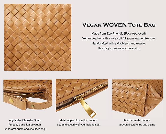 This is a be very nice vegan leather bag. The braids are done well. The metal fixings are nice - glad it's not plastic. It can hold a decent amount. I'm happy with it!