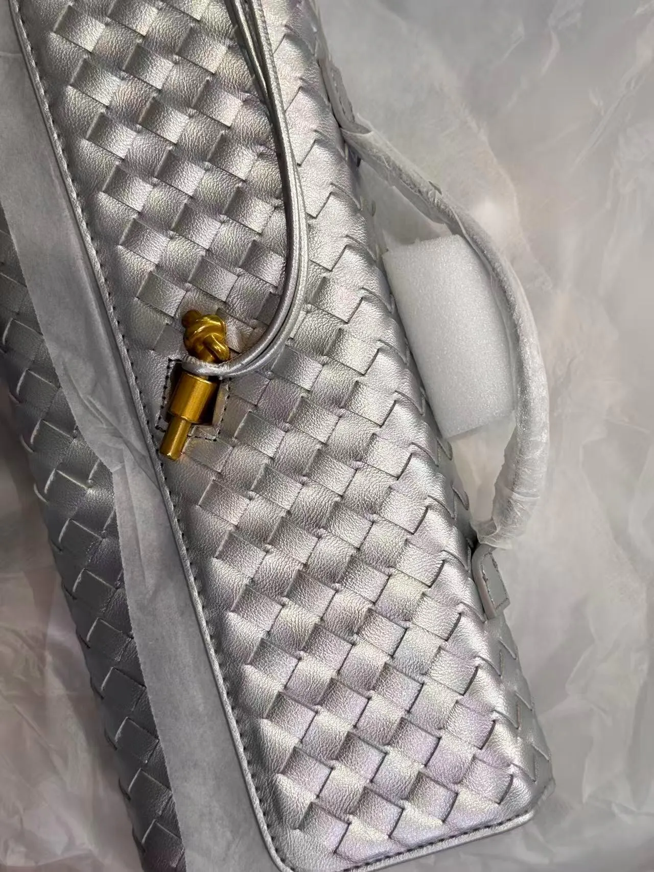 Made from premium vegan leather, this clutch features a hand-woven design and gold-tone twist-lock for timeless elegance. Its compact yet roomy interior, plus detachable strap and top handle, make it perfect for day-to-night versatility.