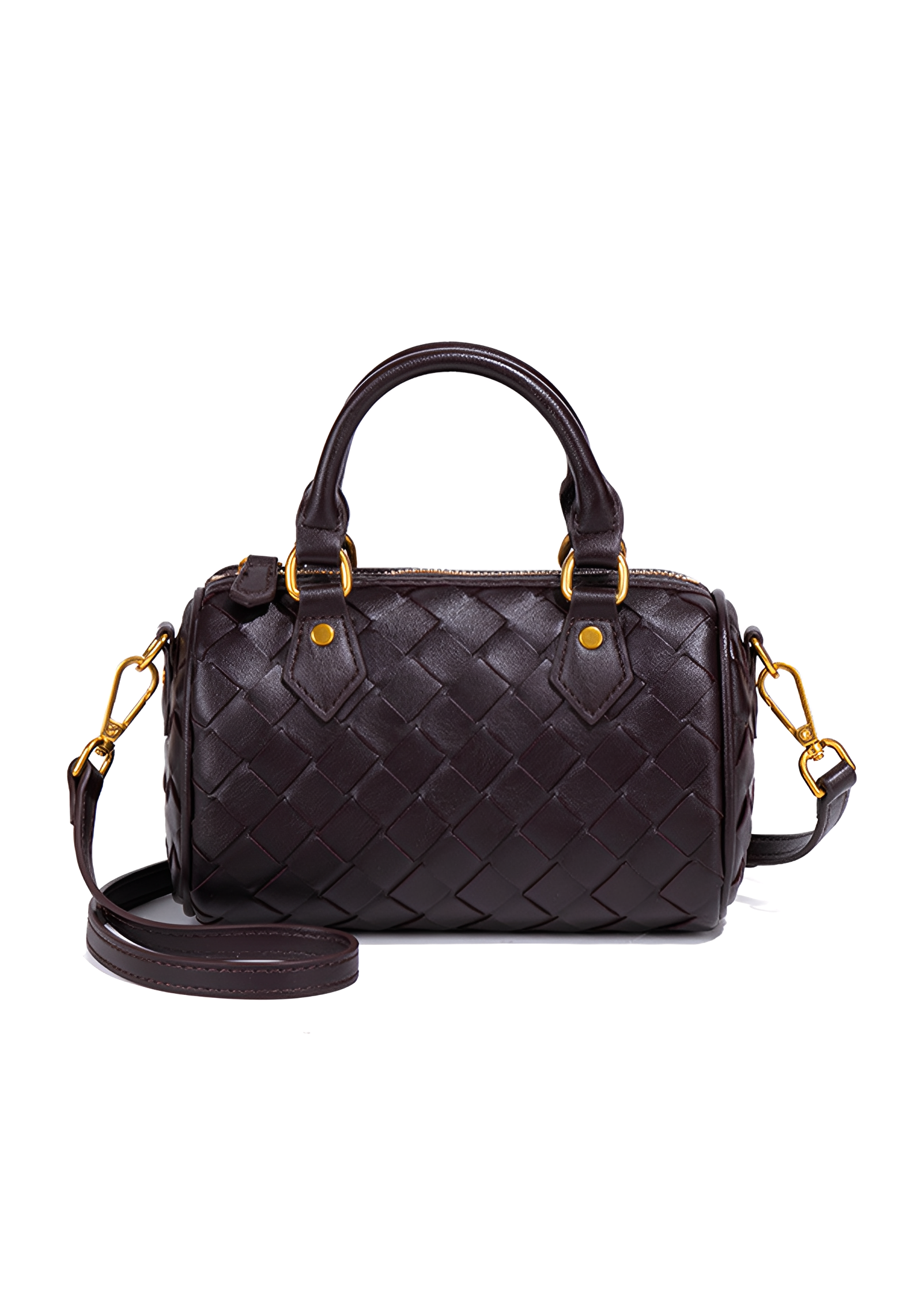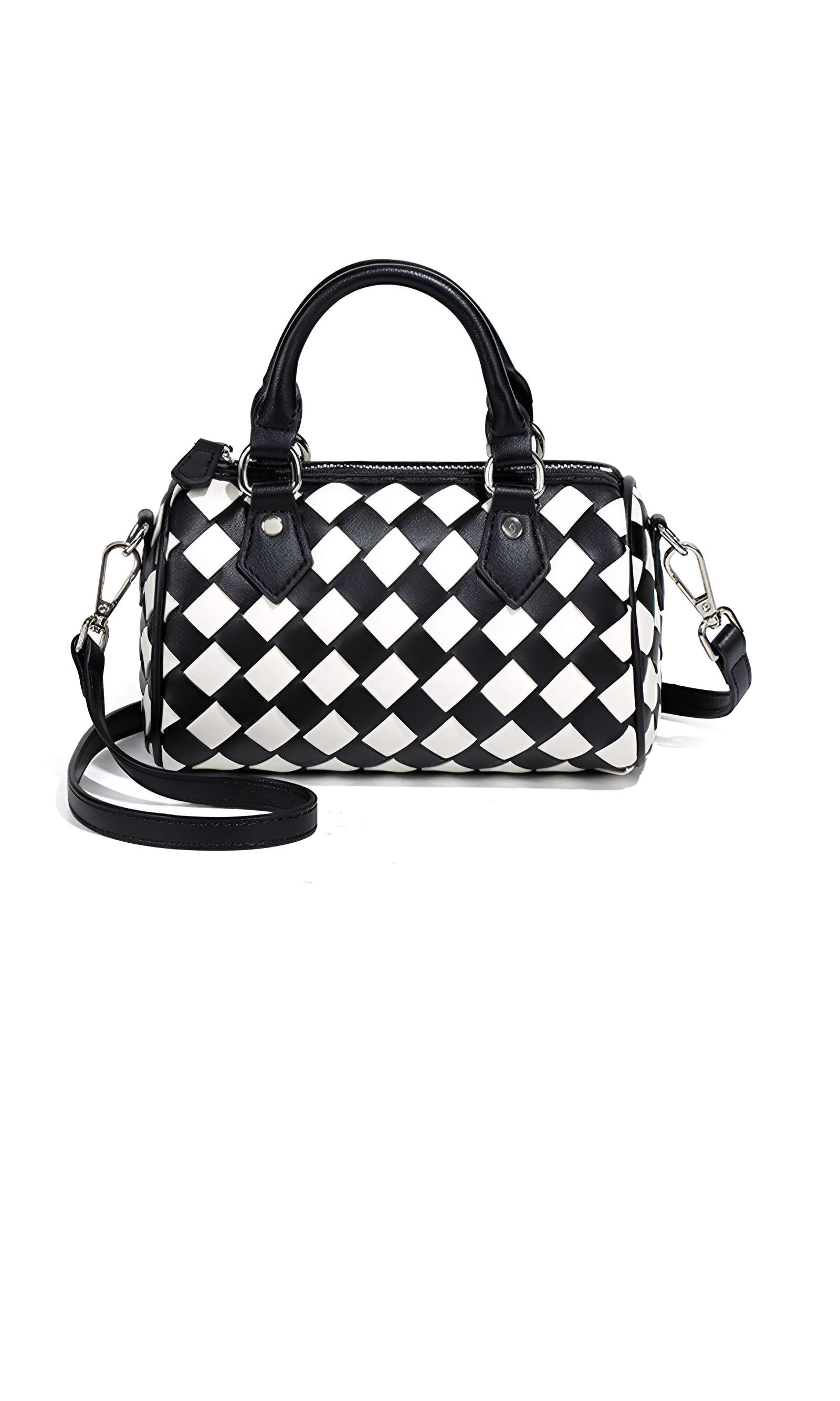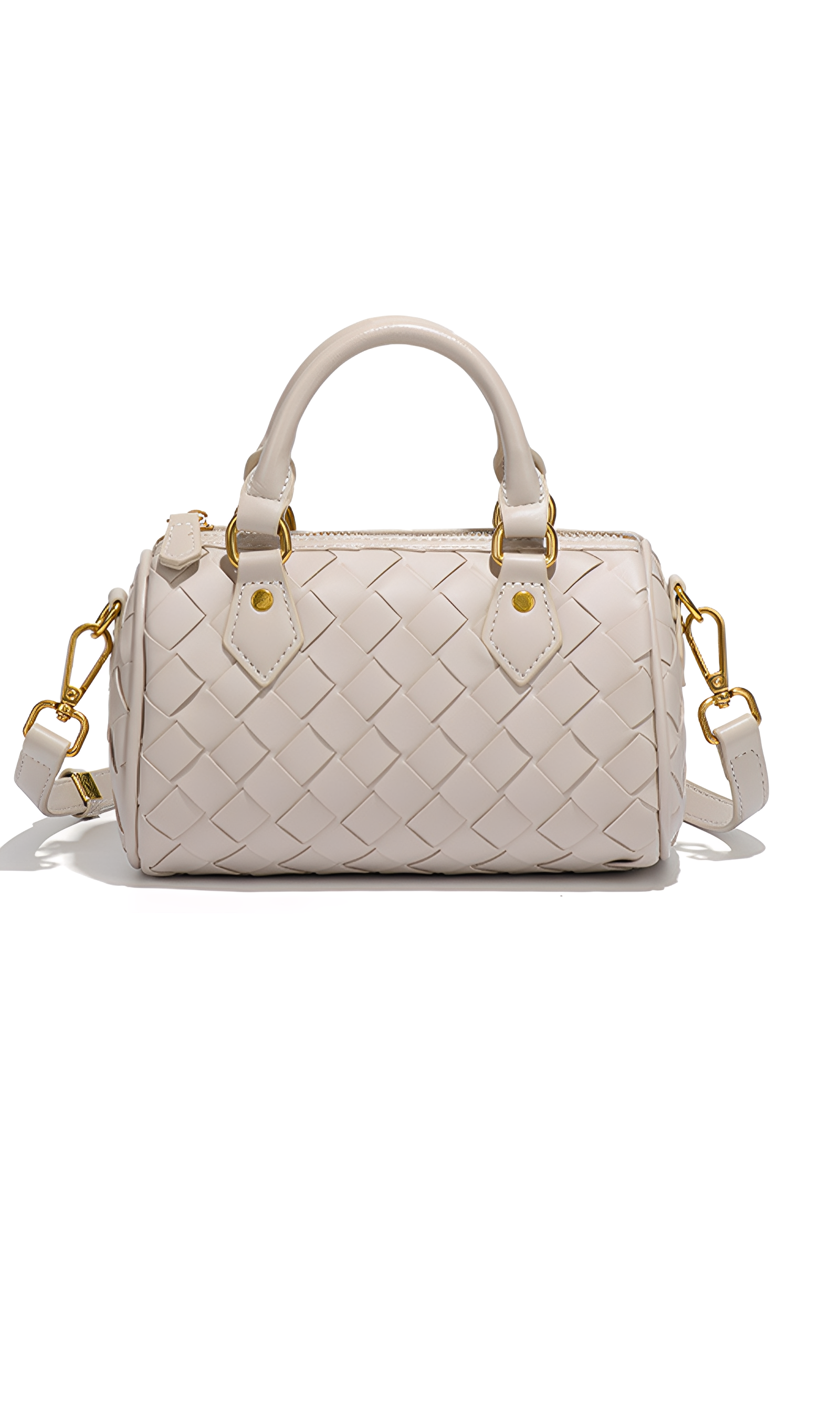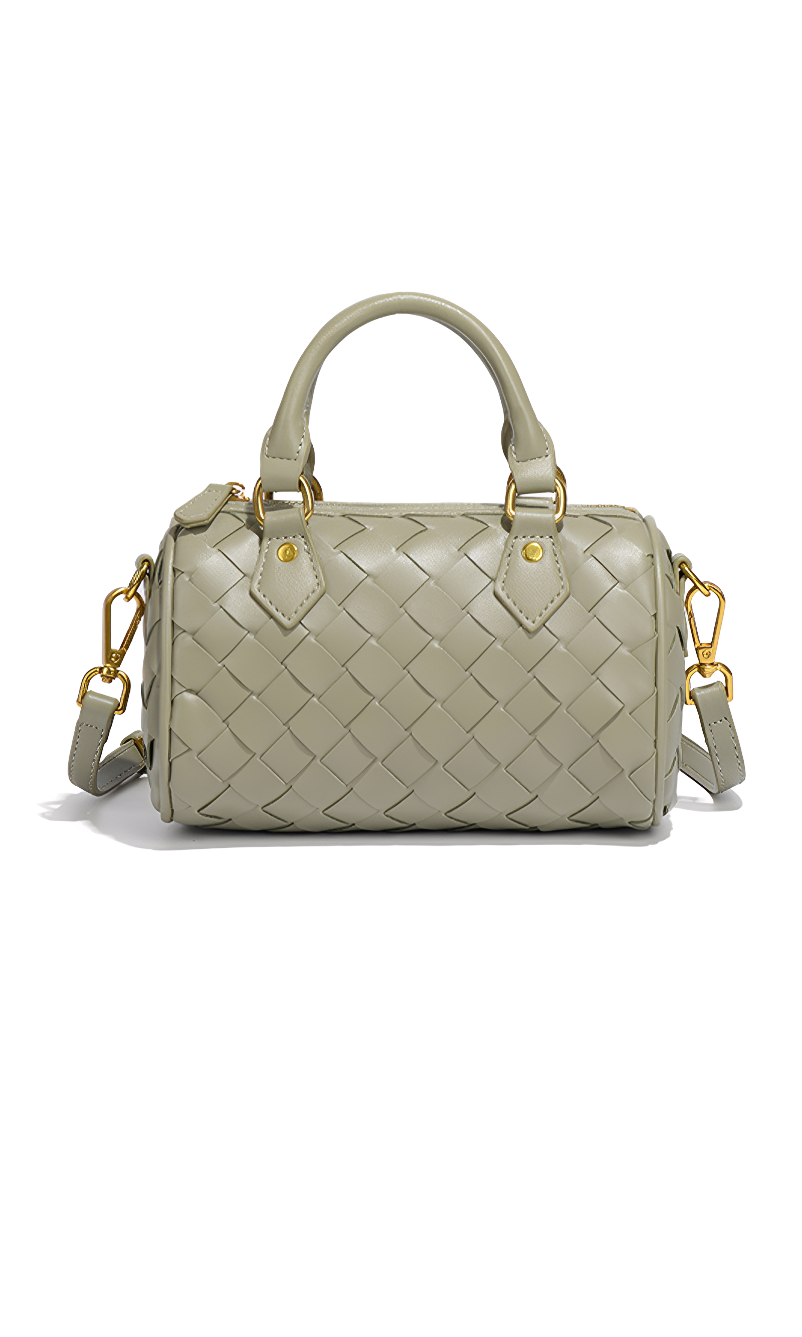 The Novara Weave is a harmony of compact elegance and refined craftsmanship. Defined by its petite silhouette and cylindrical structure, this bag reimagines the classic Boston style with a touch of modern sophistication. Crafted from intricately woven vegan leather, its surface reveals depth, texture, and a luxurious tactile allure. The dual top handles, detachable crossbody strap, and polished hardware ensure versatile styling, while the structured form lends timeless refinement. This bag embodies balance—delicate yet practical, classic yet contemporary.