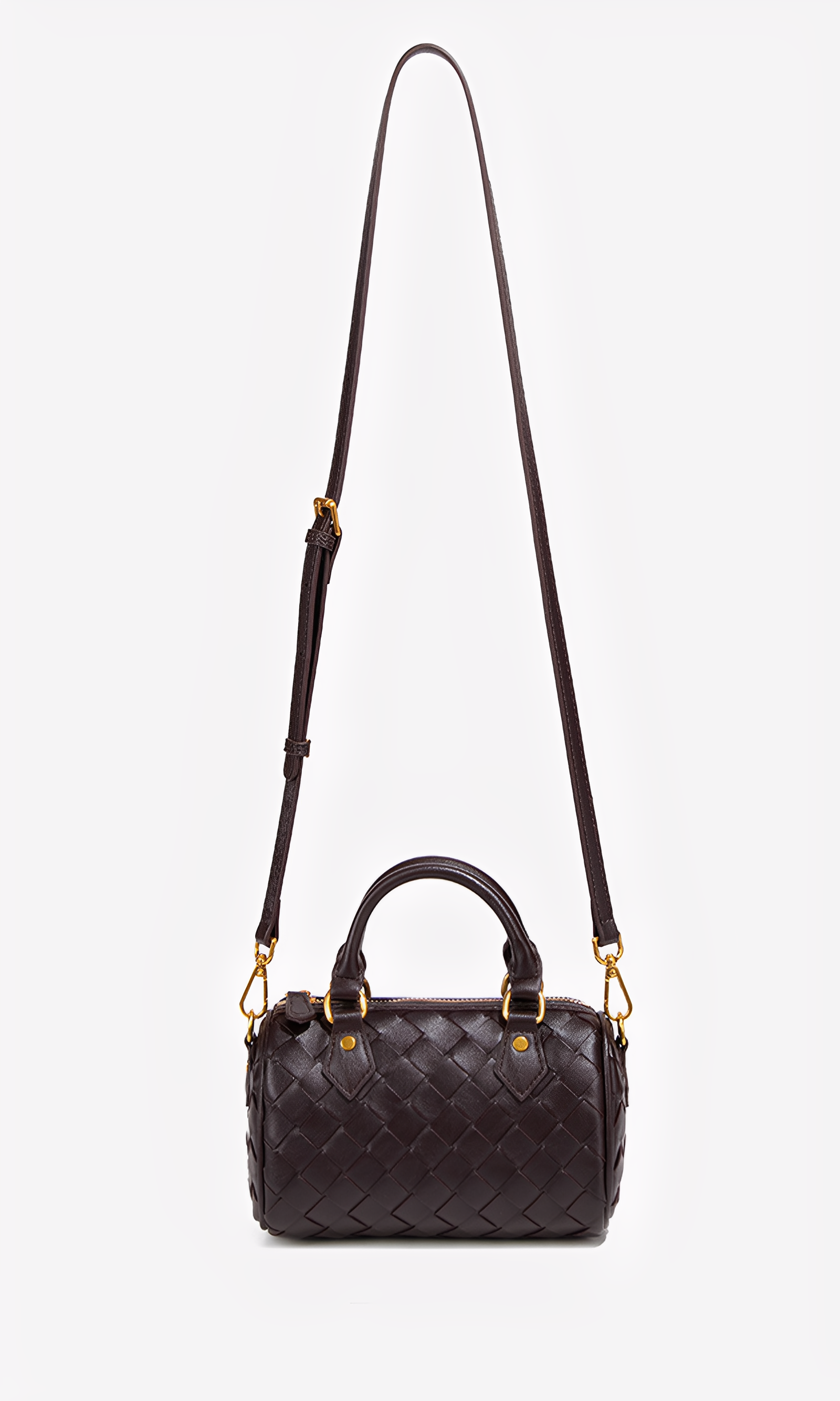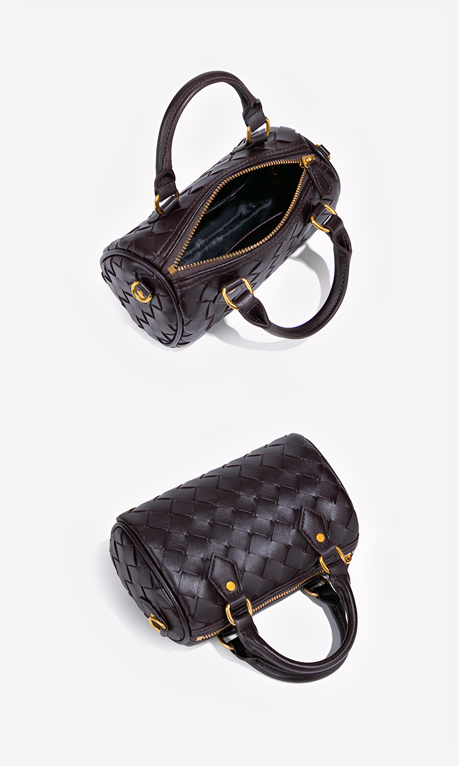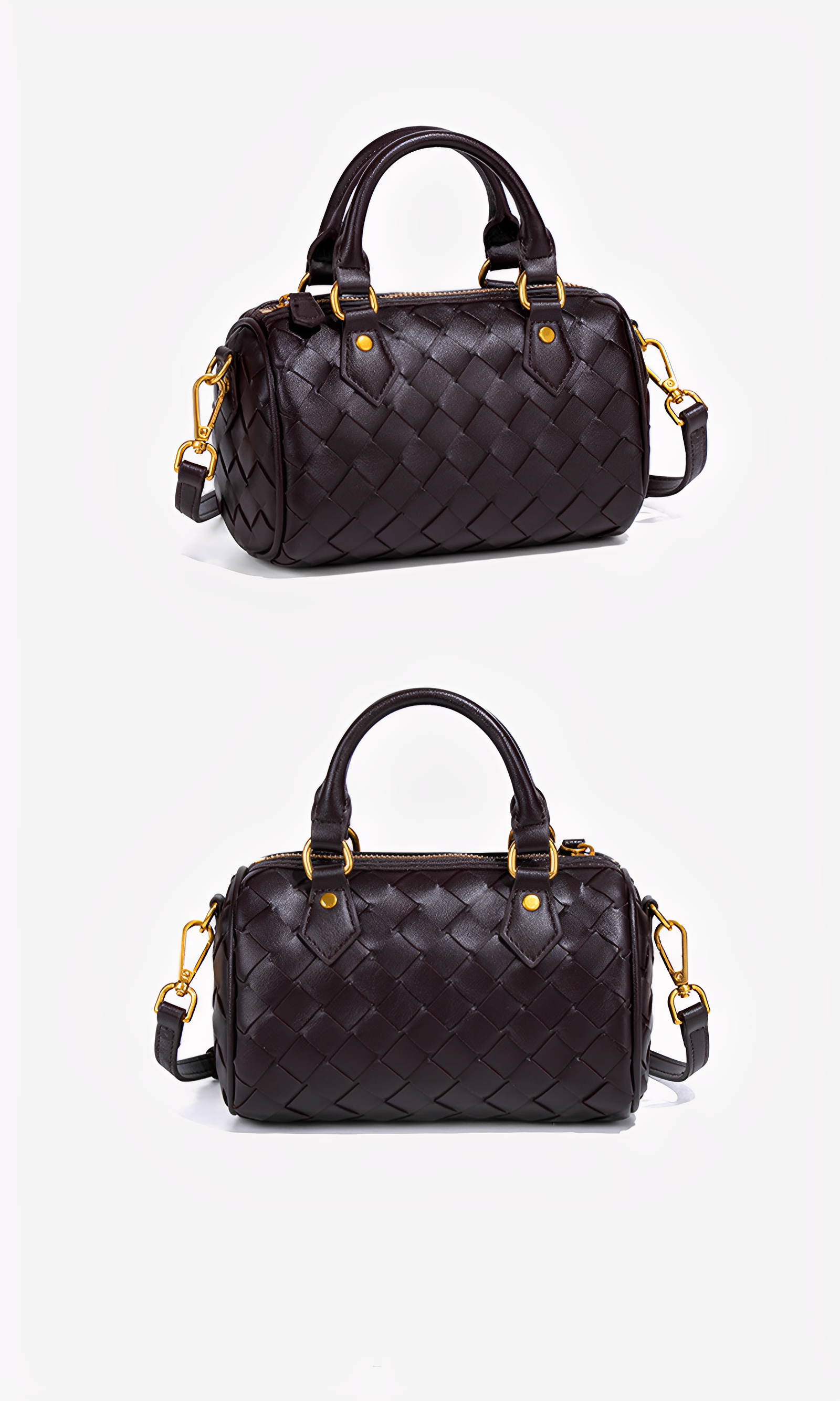 The Novara Weave is a harmony of compact elegance and refined craftsmanship. Defined by its petite silhouette and cylindrical structure, this bag reimagines the classic Boston style with a touch of modern sophistication. Crafted from intricately woven vegan leather, its surface reveals depth, texture, and a luxurious tactile allure. The dual top handles, detachable crossbody strap, and polished hardware ensure versatile styling, while the structured form lends timeless refinement. This bag embodies balance—delicate yet practical, classic yet contemporary.