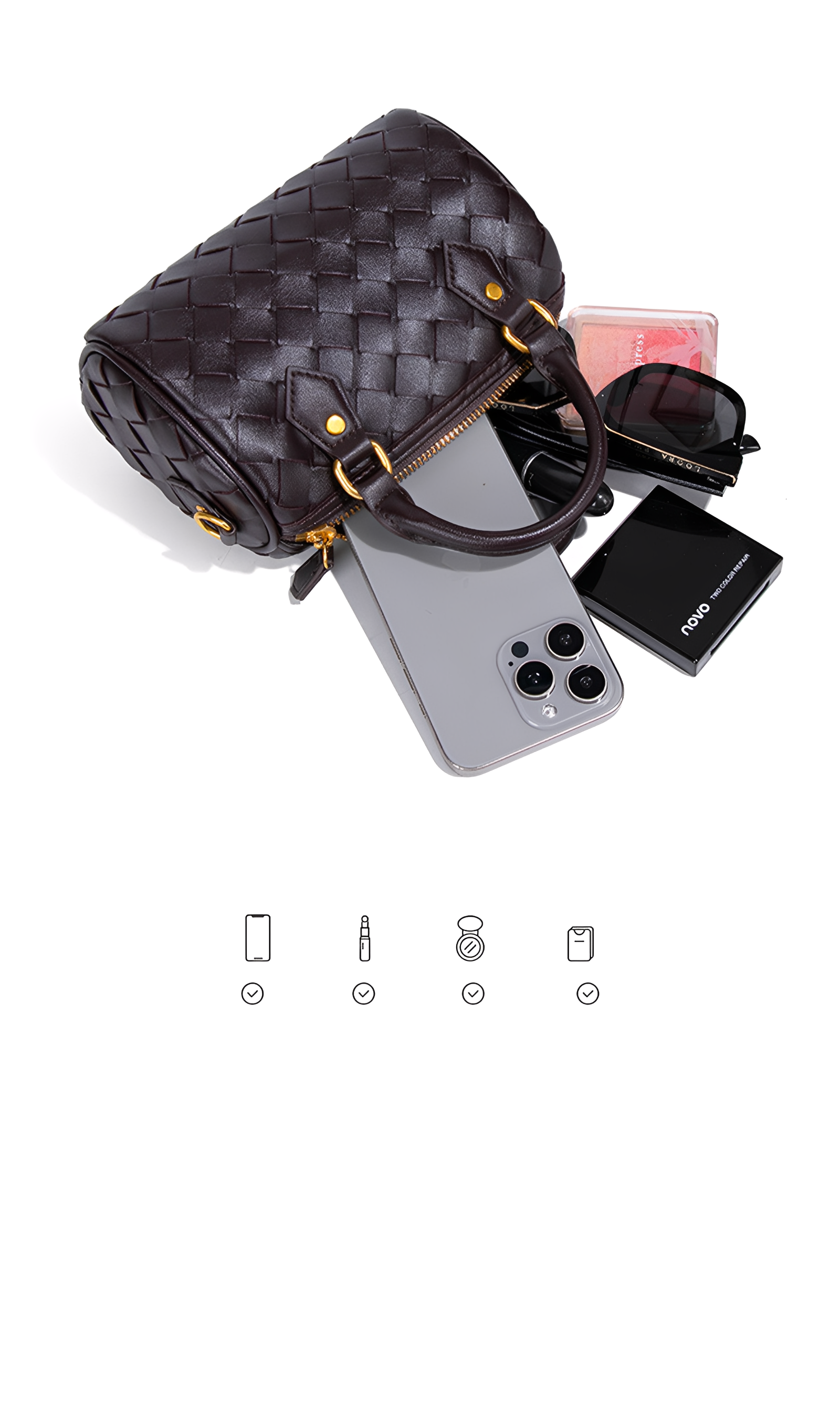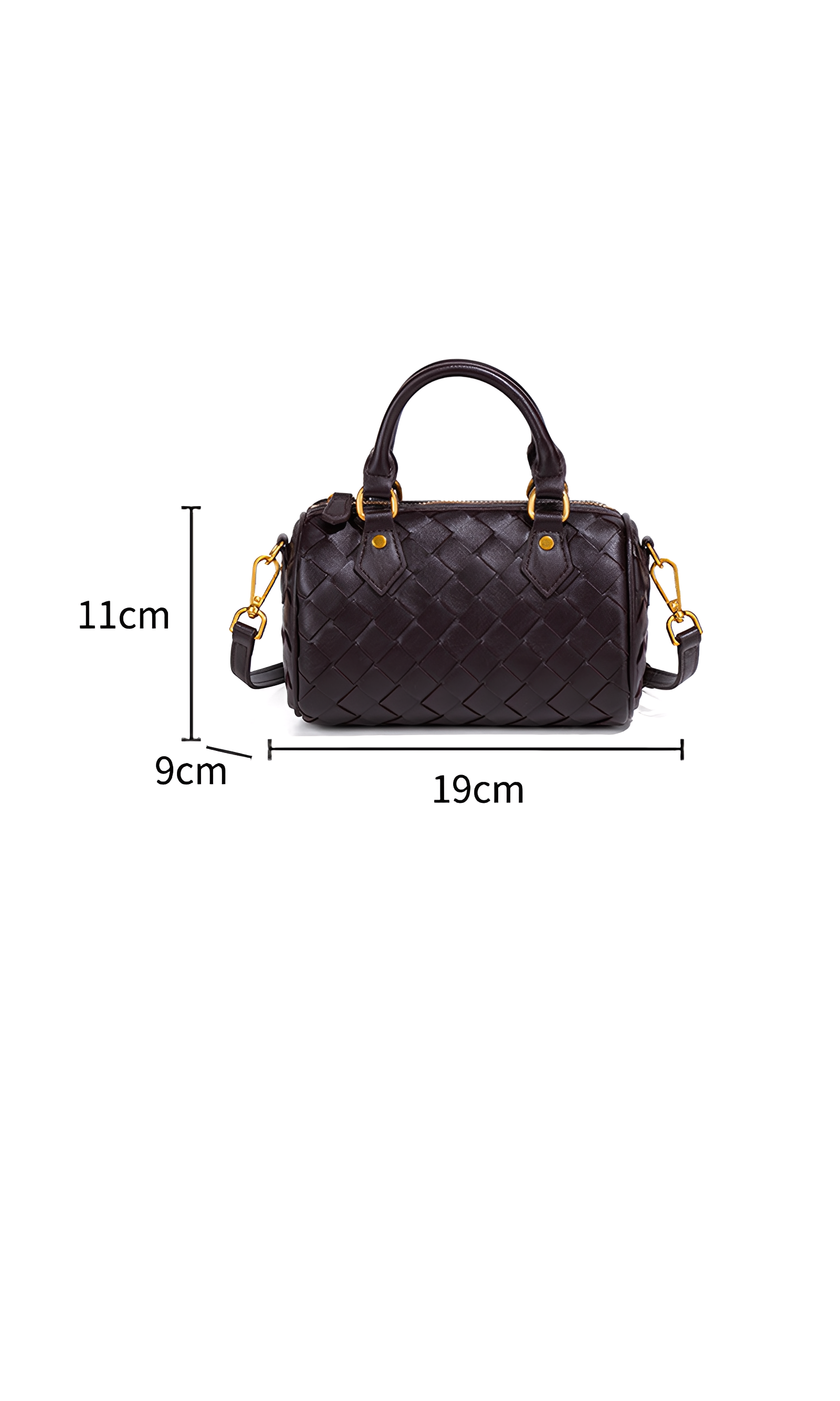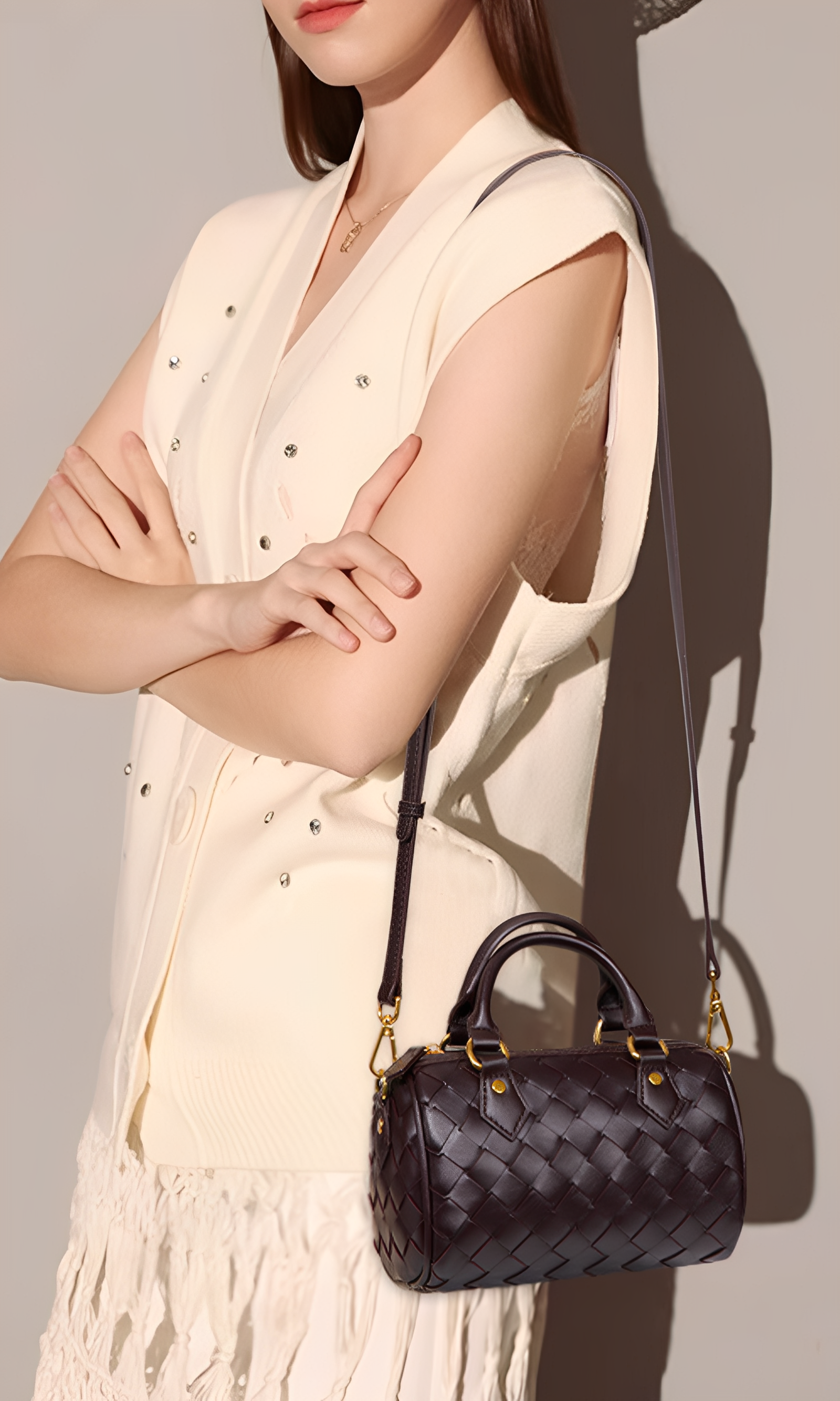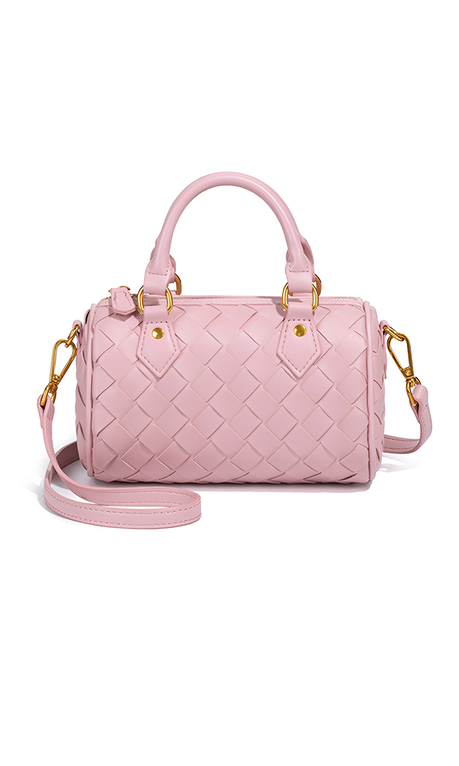 The Novara Weave is a harmony of compact elegance and refined craftsmanship. Defined by its petite silhouette and cylindrical structure, this bag reimagines the classic Boston style with a touch of modern sophistication. Crafted from intricately woven vegan leather, its surface reveals depth, texture, and a luxurious tactile allure. The dual top handles, detachable crossbody strap, and polished hardware ensure versatile styling, while the structured form lends timeless refinement. This bag embodies balance—delicate yet practical, classic yet contemporary.
