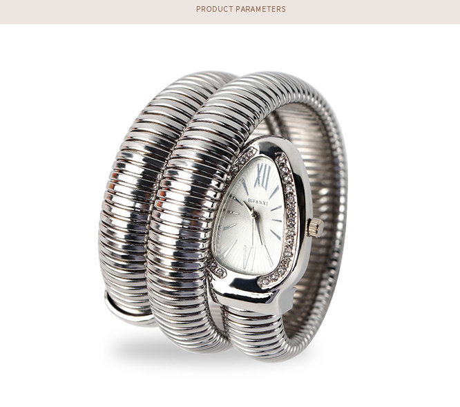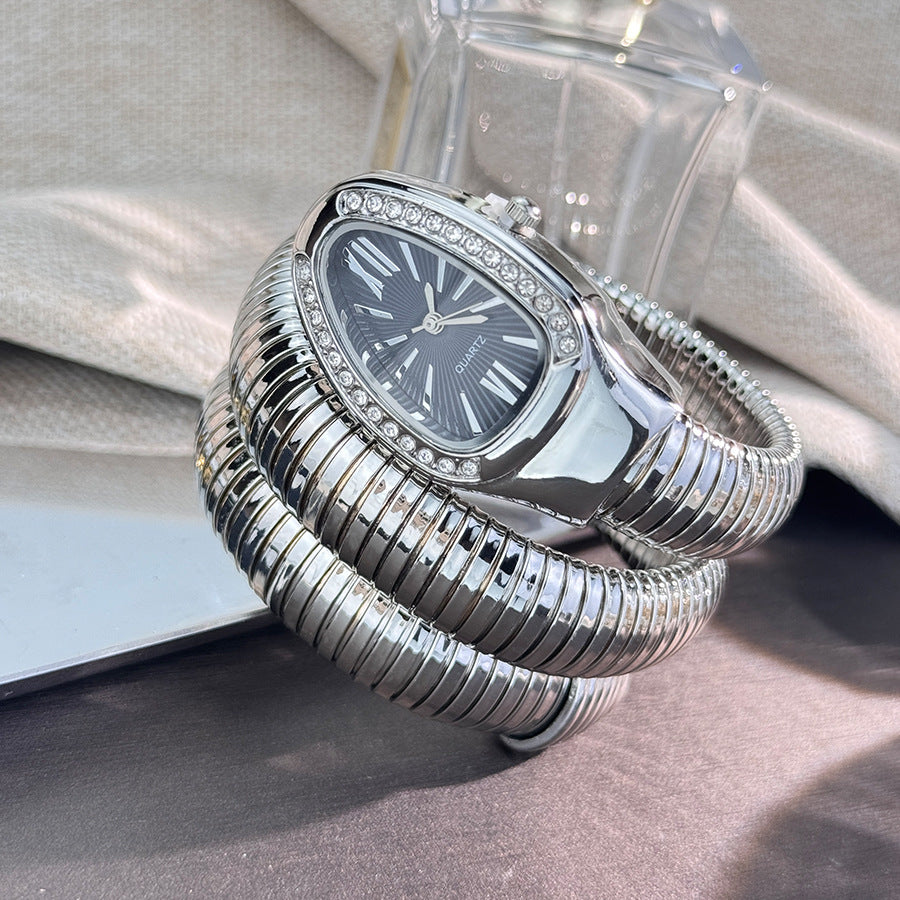 The Serpentine Luxe Coil Watch is designed for women who embrace opulence with confidence. Wrapped in a gleaming, fluid coil bangle, this statement timepiece blends high jewelry aesthetics with refined quartz precision—an irresistible symbol of power and femininity.