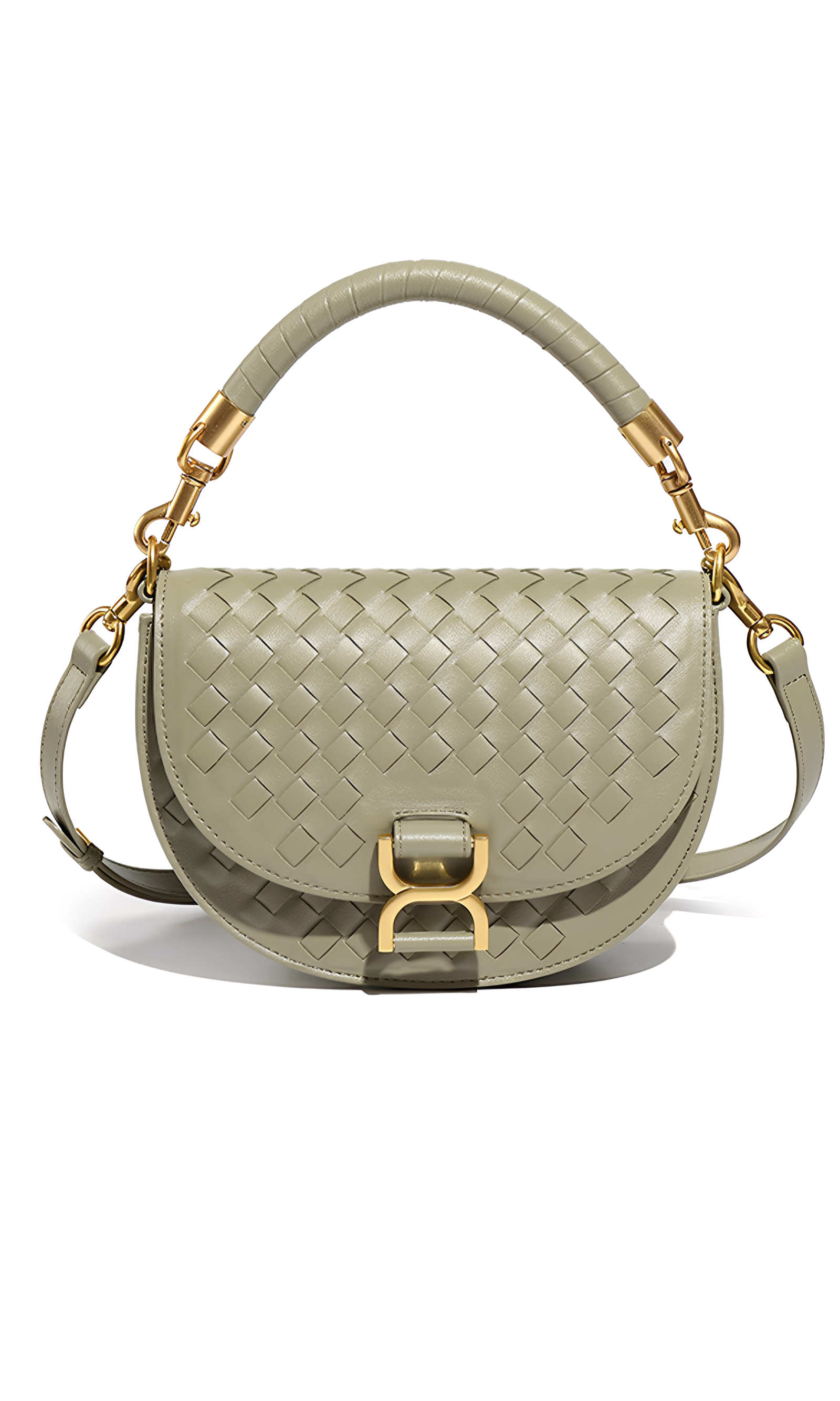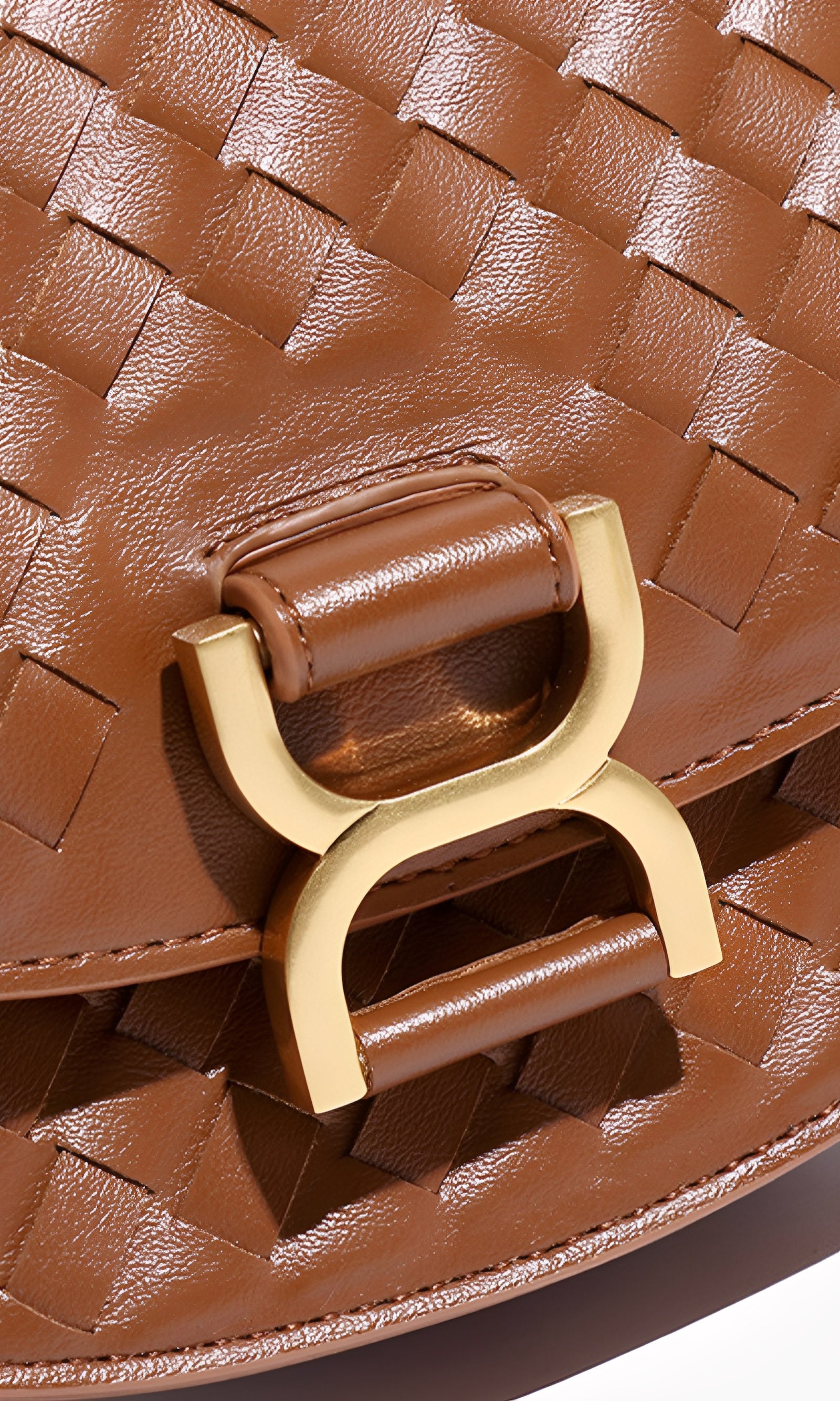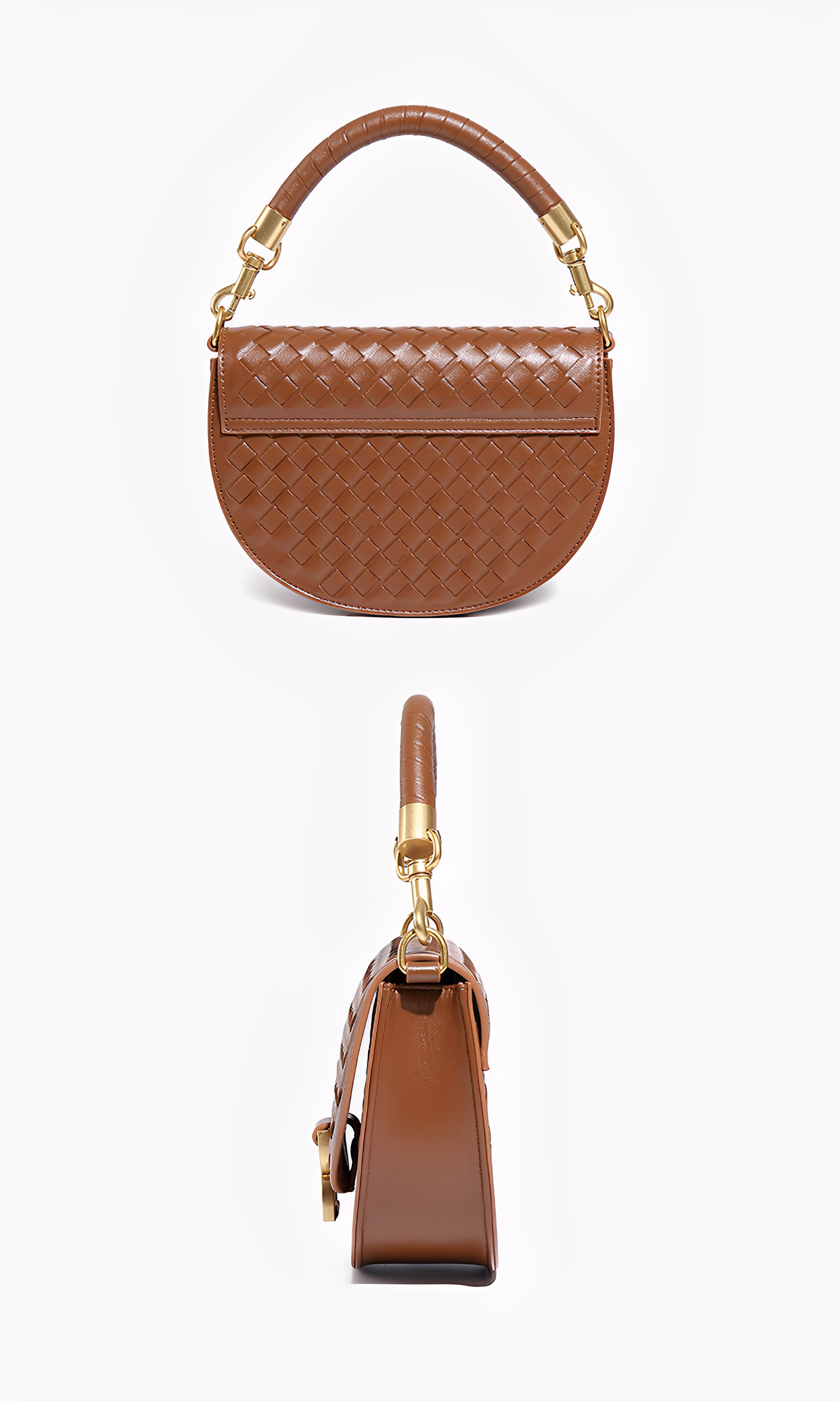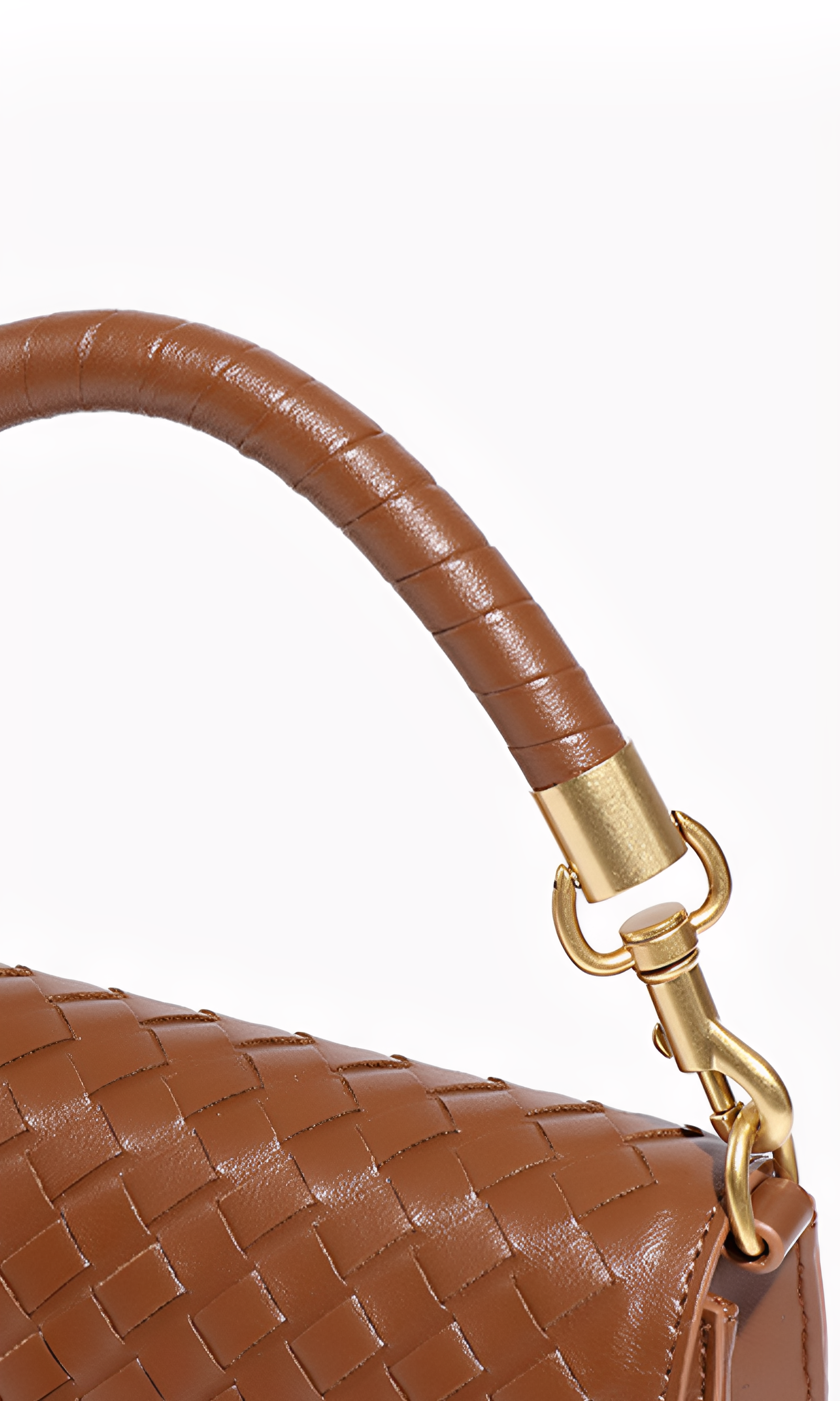 The Terra Weave is a harmony of timeless craftsmanship and modern refinement. Defined by its compact silhouette and curved flap form, this bag reimagines the classic top-handle style with a touch of artisanal sophistication. Crafted from intricately woven vegan leather, its surface reveals a luxurious texture and tactile allure, while the polished hardware provides a subtle gleam of elegance. The structured handle and detachable strap ensure versatile styling, lending both grace and practicality. This bag embodies balance—delicate yet enduring, traditional yet contemporary.