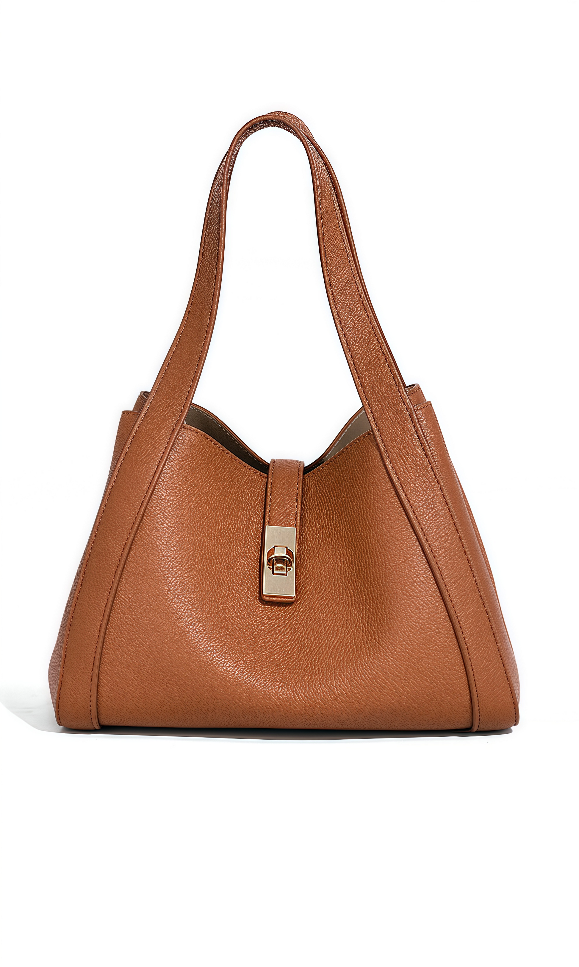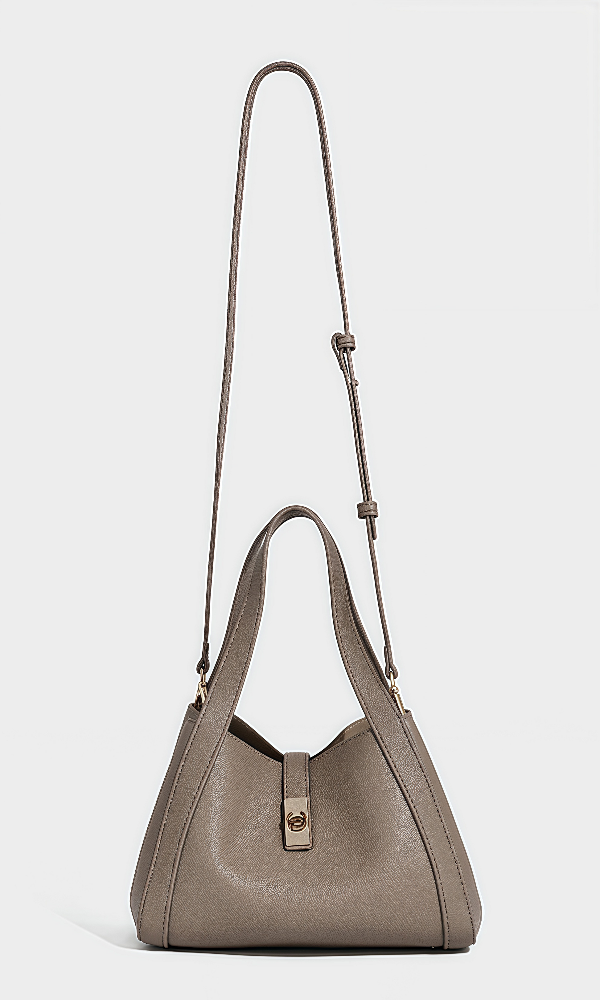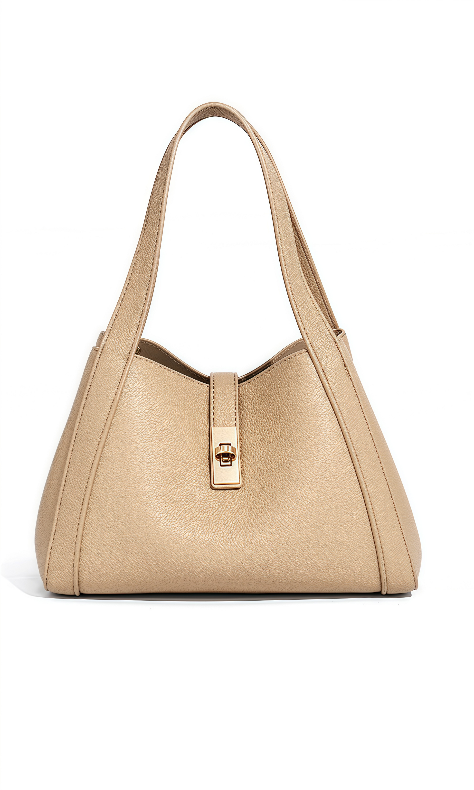 The Urban Poise Bag is a refined expression of contemporary elegance and effortless sophistication. Defined by its soft trapezoidal silhouette and fluid structure, this bag reimagines the classic tote with modern minimalism. Crafted from supple vegan leather with a natural grain finish, its surface reveals a tactile allure and understated luxury. The polished turn-lock closure provides a secure accent, while the wide handles and adjustable strap ensure versatile styling. This bag embodies harmony—sleek yet spacious, timeless yet modern.