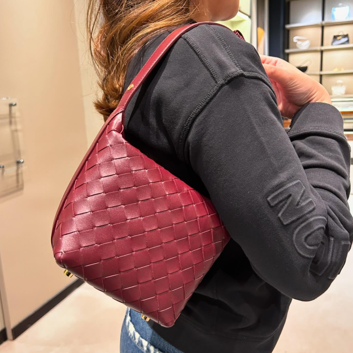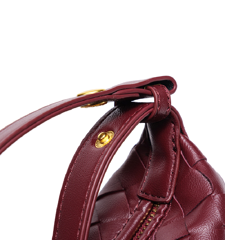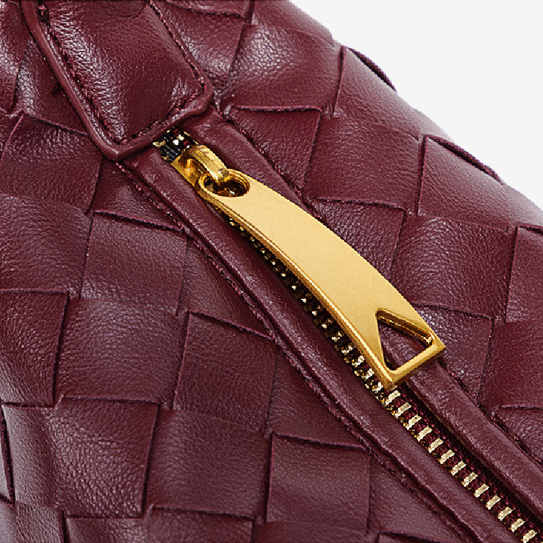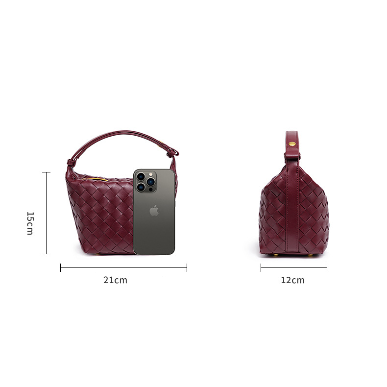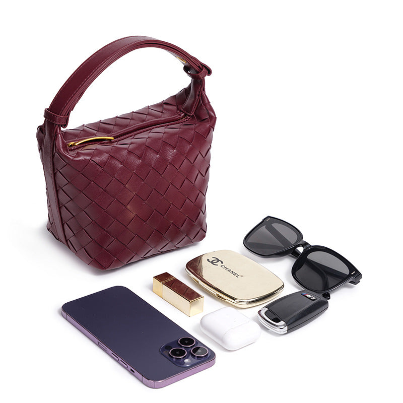 This burgundy woven bag offers a spacious interior that can comfortably hold a smartphone, sunglasses, a compact mirror, lipstick, and earphones, making it ideal for everyday use.